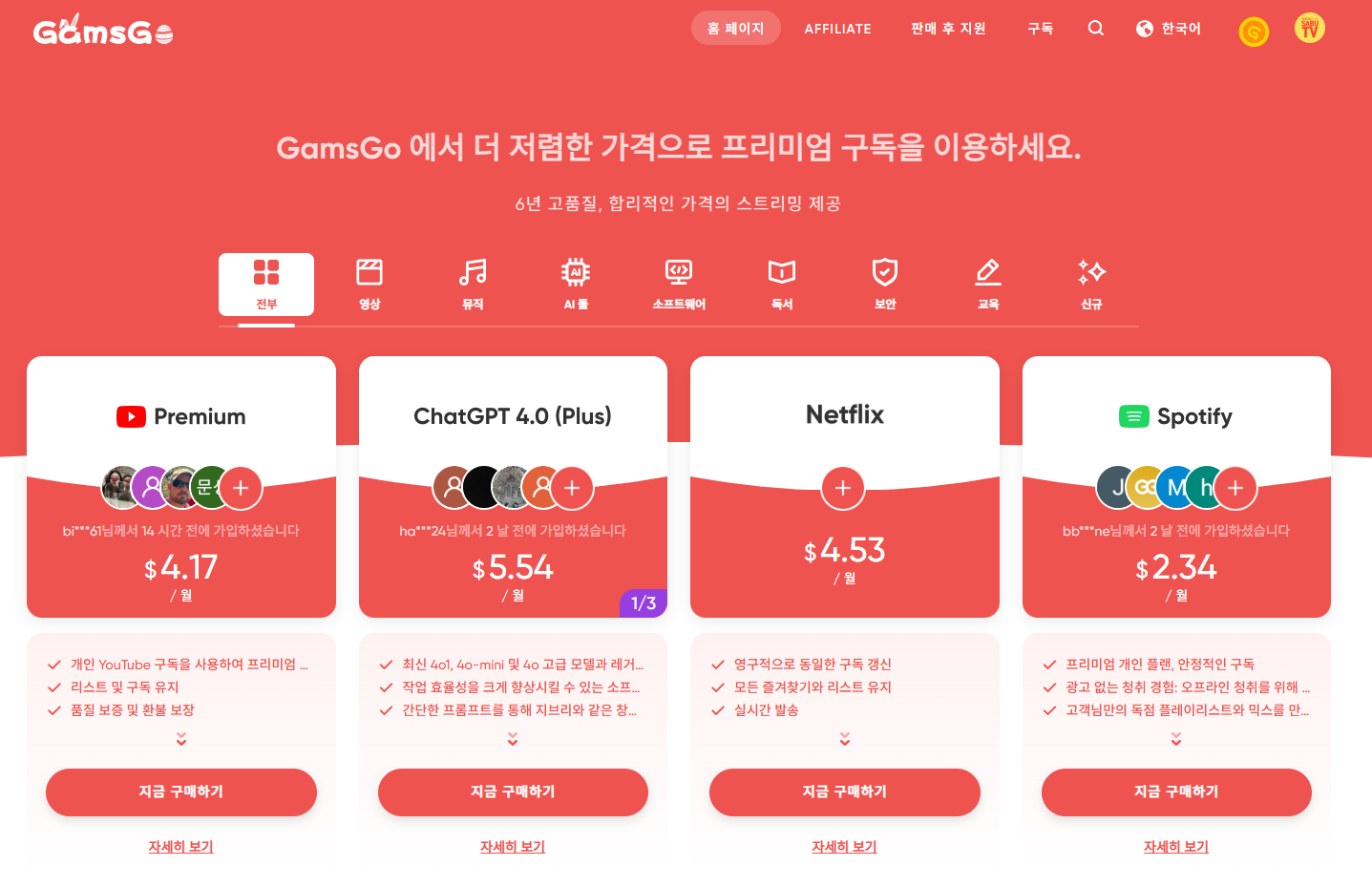 겜스고로 챗GPT 플러스 월 8천 원에 사용하는 비결매월 3만 원이 넘는 챗GPT 플러스 구독료가 부담되시나요? 겜스고를 활용하면 같은 서비스를 75% 할인된 가격에 이용할 수 있어요. 월 8천 원대로 AI 이미지 생성부터 대용량 파일 분석까지, 챗GPT의 프리미엄 기능을 모두 누릴 수 있는 방법을 알려드릴게요. 겜스고가 뭔가요?겜스고는 넷플릭스, 디즈니플러스 같은 유료 구독 서비스를 여러 사람이 함께 사용해 비용을 나눌 수 있는 플랫폼이에요. 특히 해외 결제가 필요한 서비스를 국내 결제 수단으로 쉽게 이용할 수 있게 해주어 한국 사용자들에게 인기가 많아요. 겜스고의 가장 큰 장점은 복잡한 해외 결제 과정 없이 카카오페이나 네이버페이 같은 친숙한 결제 수단으로 구독할 수 있다는 점이에요. 2024년 11..