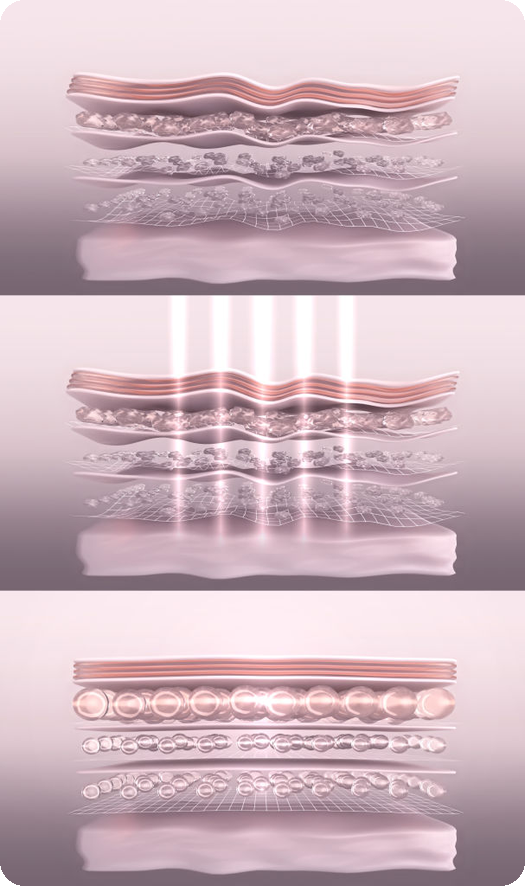 - 기존 콜라겐의 수축: 피부 온도가 60도 이상으로 올라가면 기존 콜라겐이 수축하게 되므로, 피부 탄력이 즉시 증가하게 됩니다.