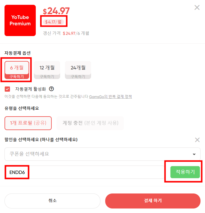 겜스고 유튜브 프리미엄 구독 시 할인코드를 활용하면 더 저렴하게 이용할 수 있어요. 할인코드 'ENDD6'를 입력하면 기본 가격에서 추가 할인이 적용된답니다.