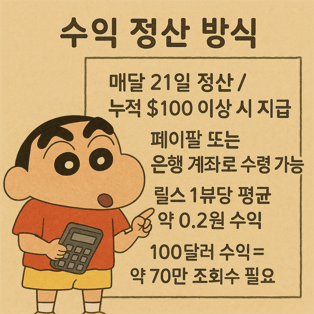 - 100달러 수익 = 약 70만 조회수 필요